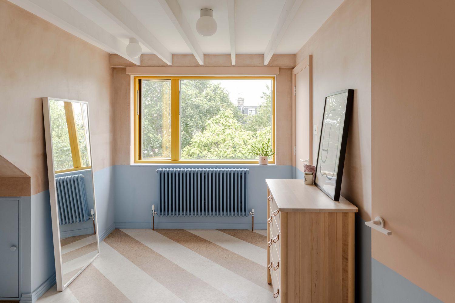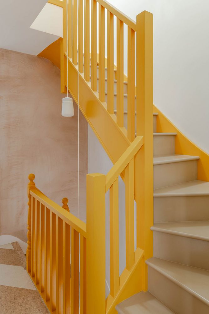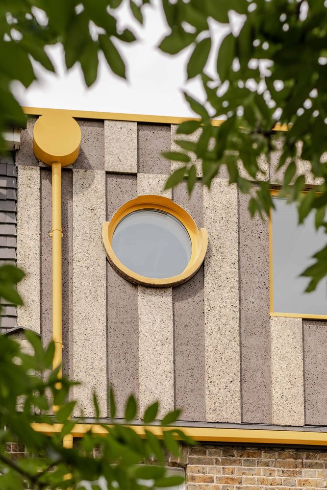 У спальні передбачено велике прямокутне вікно з видом на дерева, а у ванній - кругле вікно та верхнє освітлення над душем. Додатковими акцентами стали жовті елементи - рами, водостоки та сходи, які підкреслюють вертикальний зв’язок між існуючою частиною будинку та новою надбудовою.