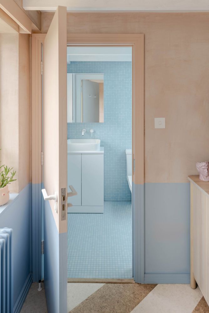 В оформленні інтер’єру поєднали фактурні поверхні та кольорові акценти. Шорстка штукатурка на стінах узгоджується з текстурою корка, а світло-блакитний колір використано як наскрізний елемент, зокрема у ванній кімнаті разом із мозаїкою.