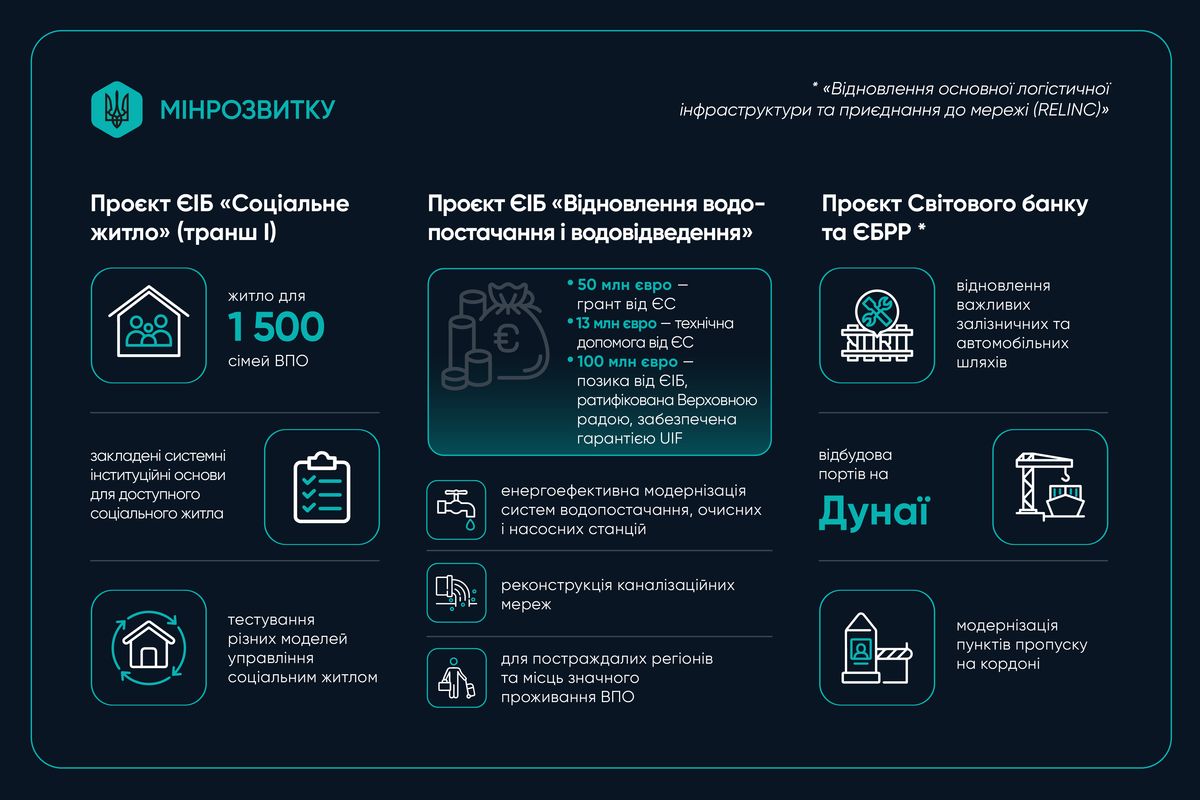 Програма UIF із загальним ресурсом 9,4 млрд євро вже розподілила 6,2 млрд євро; наразі схвалено старт трьох ключових проєктів для житла, транспорту та комунальних мереж