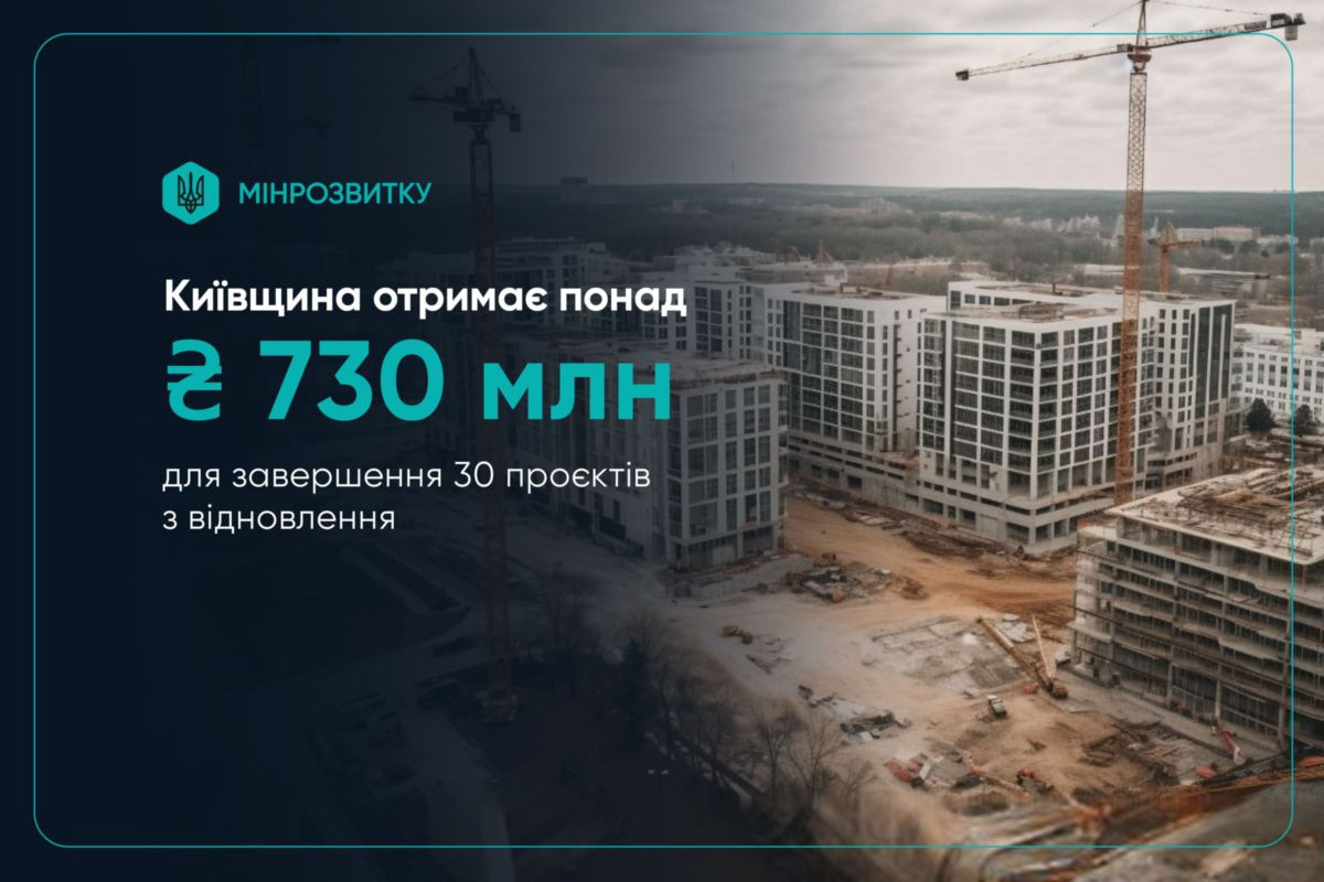Понад 730 млн гривень отримають Київська обласна військова адміністрація, Бучанська та Ірпінська міські громади для завершення проєктів відбудови в регіоні.