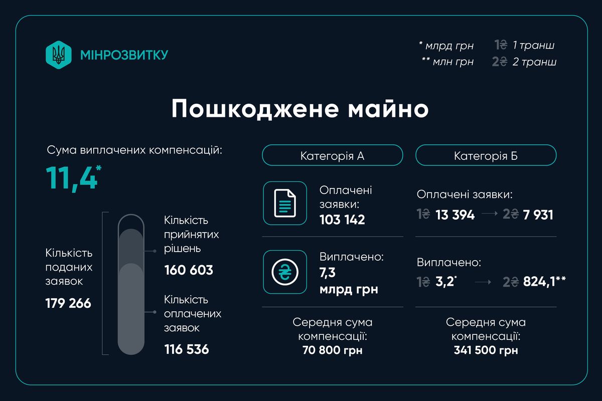 З них за житло, яке зазнало пошкоджень – понад 116 500 родин отримали компенсацію загальною сумою 11,4 мільярда гривень. Загальна кількість заяв станом на цю дату перевищує 179 тисяч. В межах виплат за категоріями: на дрібні ремонти (категорія А) та капітальні ремонти (категорія В) – середній розмір виплати становить 70 800 грн та 341 500 грн відповідно.
