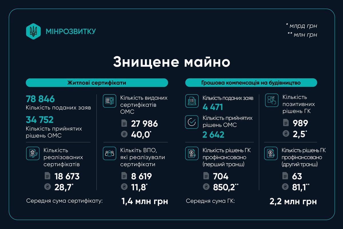 Щодо знищеного житла: понад 28 000 родин отримали житлові сертифікати для придбання нового житла замість зруйнованого, на суму близько 40 мільярдів гривень. Загалом подано понад 78 тисяч заявок. Із них вже понад 18 600 сімей оформили купівлю нового житла, серед яких більше 8 600 – це родини внутрішньо переміщених осіб. На початку року уряд додатково перерозподілив 15 мільярдів гривень саме для компенсацій ВПО в рамках цієї програми.