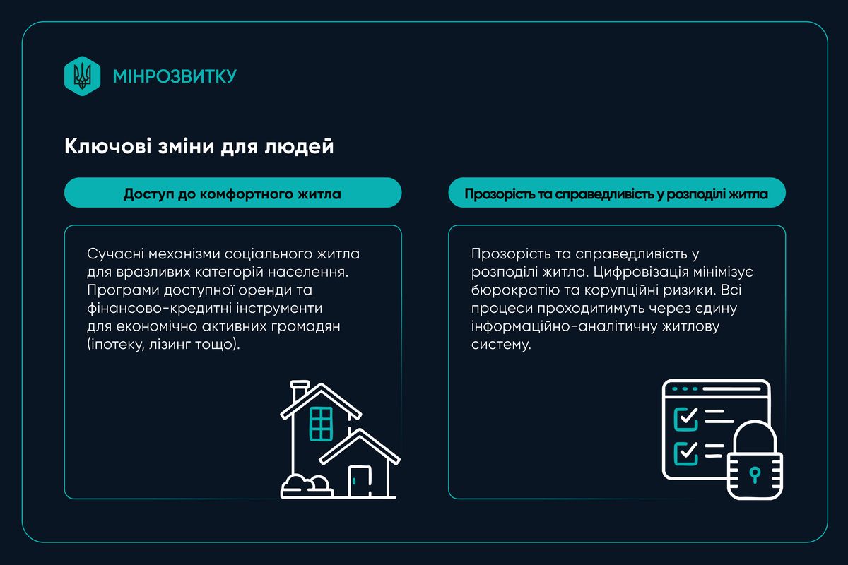 Сьогодні внаслідок російської агресії зруйновано або пошкоджено близько 13% житлового фонду (дані RDNA4), постраждали понад 2,5 млн домогосподарств, а 4,6 млн ВПО були змушені залишити свої домівки. Потреба у відновленні житлового фонду оцінюється приблизно у $84 млрд. Запуск нової житлової політики дозволить розв’язувати ці питання більш системно та впроваджувати сучасні підходи до розвитку житлової сфери.
