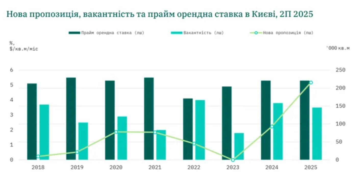 Ефективна орендна прйм-ставка залишалася стабільною на рівні $5,3/кв. м/міс. (без ПДВ та OPEX), що відповідає довоєнному піковому періоду 2019-2021 років.