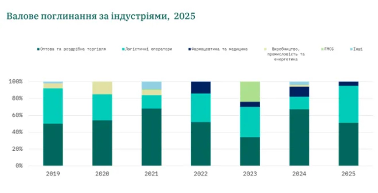 "Такий стрибок обсягу транзакцій відбувся після тривалого затишшя через відсутність нової пропозиції і мав переважно опортуністичний характер", - наголошують у компанії. Ритейлери забезпечили 51% загального валового поглинання, за ними слідували логістичні оператори (44%) і компанії фармацевтики й медицини (5%).