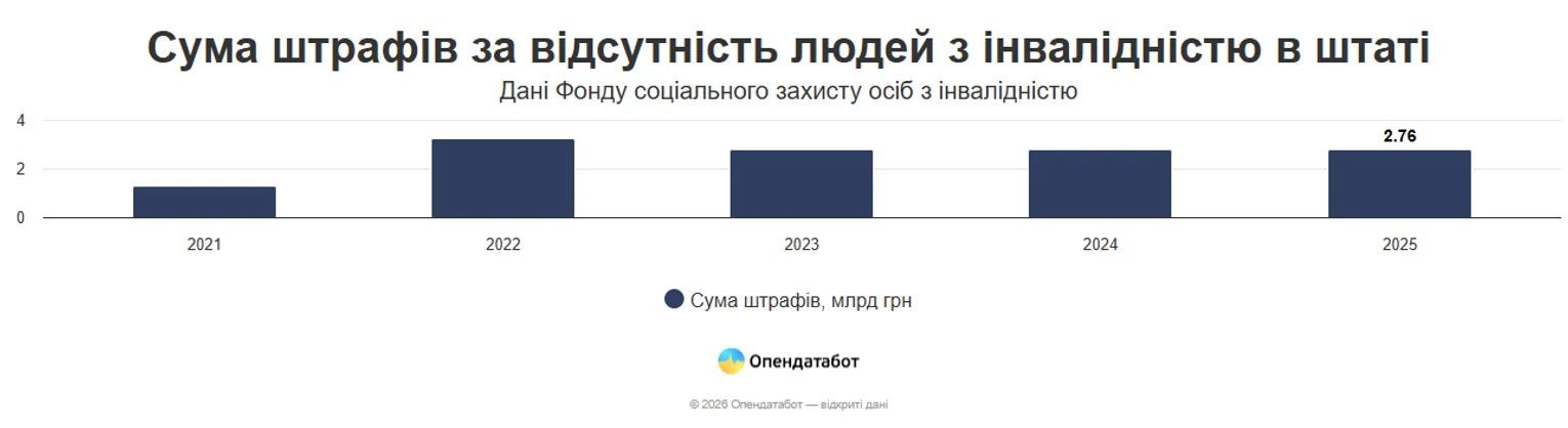 У 2025 році роботодавці в Україні отримали штрафи на загальну суму понад 2,76 млрд грн за невиконання нормативу щодо працевлаштування людей з інвалідністю.