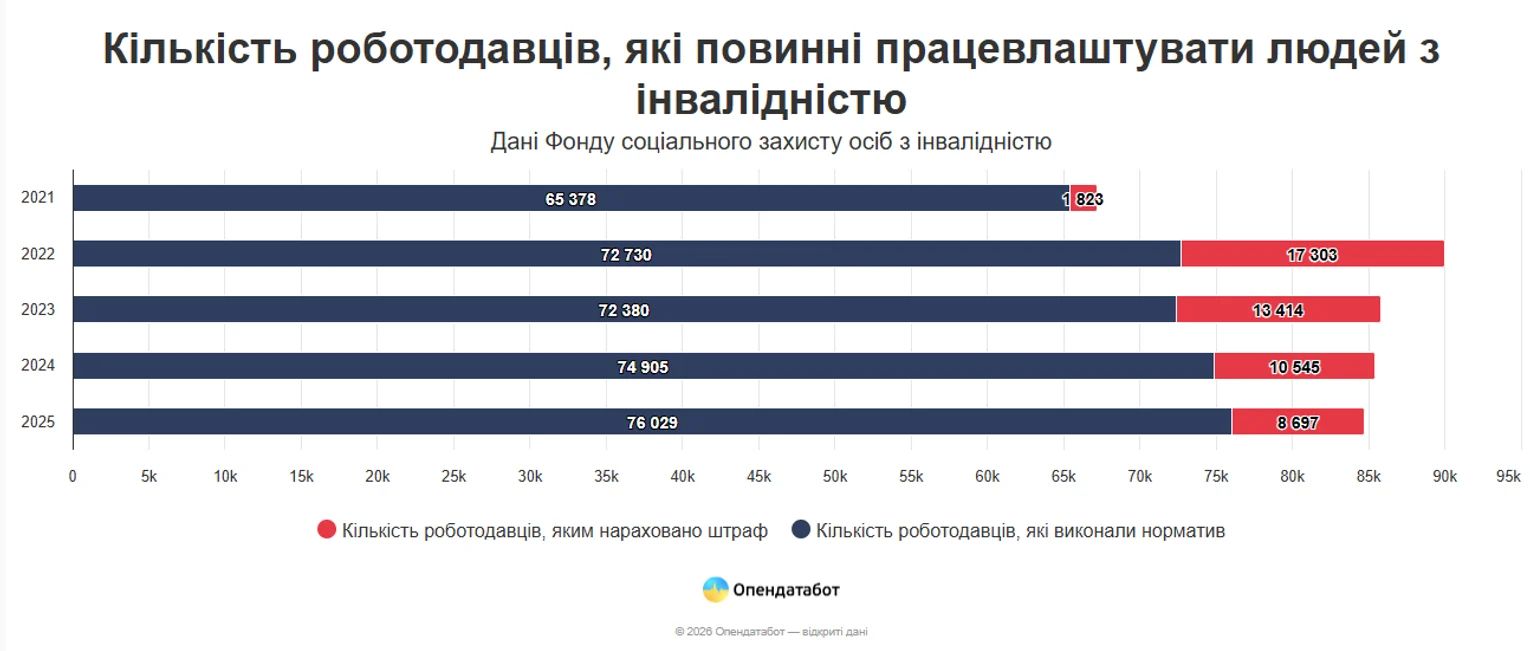 Так, 8 697 роботодавцям, які не виконали норматив, було нараховано санкції на загальну суму 2,76 мільярда гривень. Це близько 10% від усіх роботодавців, які мали працевлаштувати людей з інвалідністю за підсумками 2025 року. Для порівняння, у 2023 році цей показник сягав 17,5%, а до початку повномасштабної війни - лише 2,5%.
