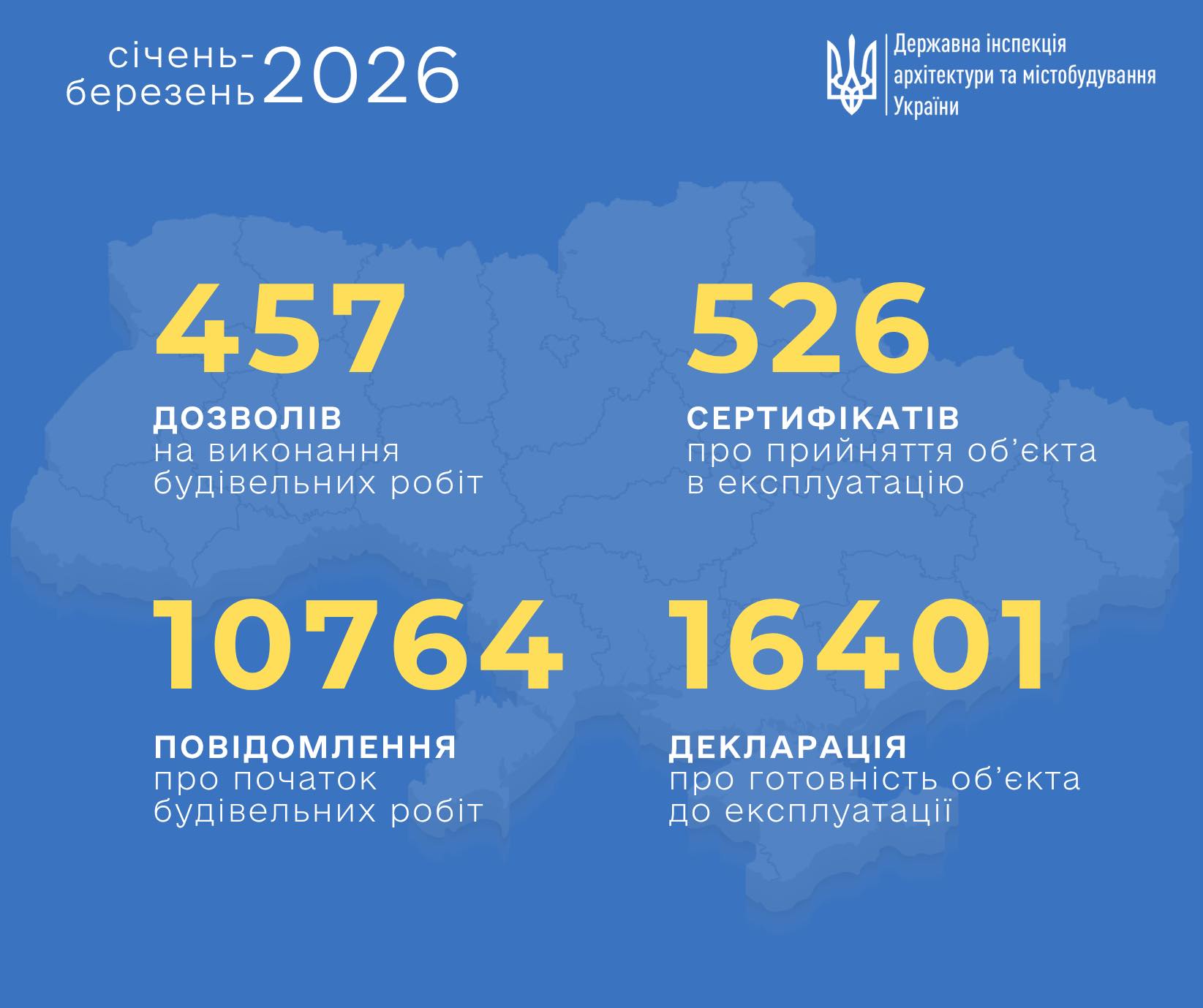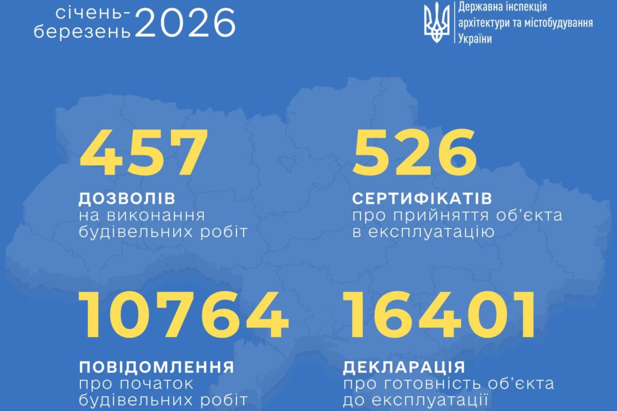 За перші три місяці 2026 року видано 457 дозволів на будівництво та прийнято 526 об’єктів в експлуатацію. Також опрацьовано понад 27 тисяч повідомлень і декларацій щодо початку та завершення робіт