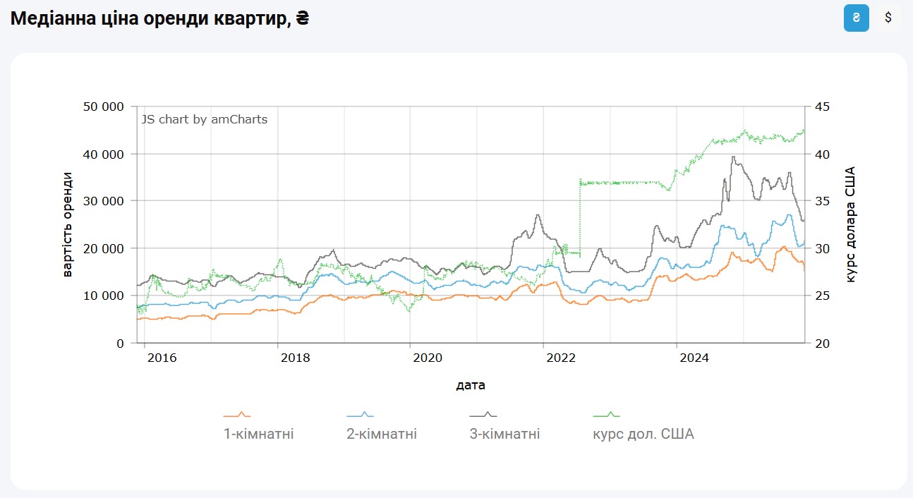 Знизилися і ціни на зйомне житло з двома кімнатами - ще восени 2024 року середня вартість на оренду двокімнатки становила 22 159, а вже у листопаді 2025 знизилася на кілька тисяч - до 20 634 грн.