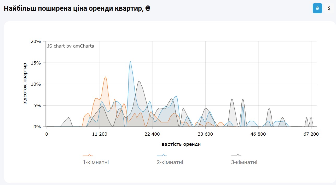 Щодо двокімнатних квартир - найчастіше в оголошеннях трапляється ціна 18 000 грн (13,8% оголошень), а трикімнатних - 19 600 грн (8,9%).