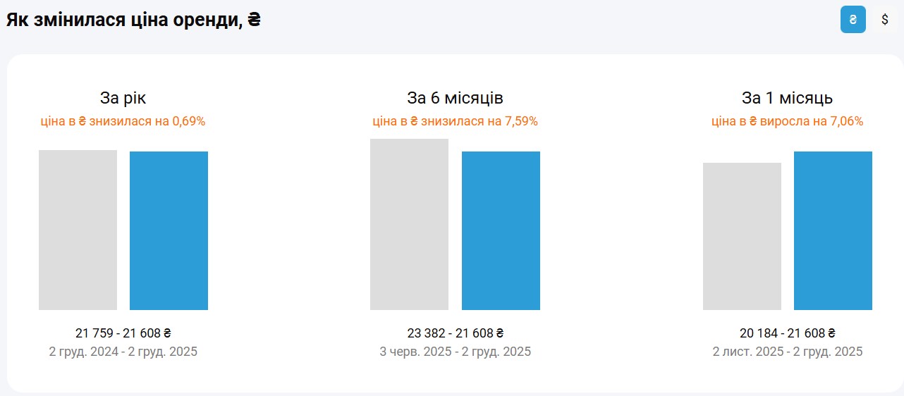 Якщо ще наприкінці листопада минулого року за оренду однокімнатки просили у середньому 18 028 грн, то у цей же період 2025 року цінник знизився на 700 грн і сягнув показника 17 308 грн.