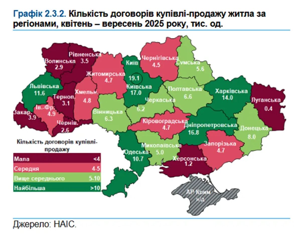 Ринок житла зараз найактивніший у Києві, Київській, Дніпропетровській та Харківській областях. На них припадає 39% угод за три квартали 2025 року. Кожне третє житло купується в обласних центрах, ще третина - в інших містах. Дві третини угод - це придбання квартир.