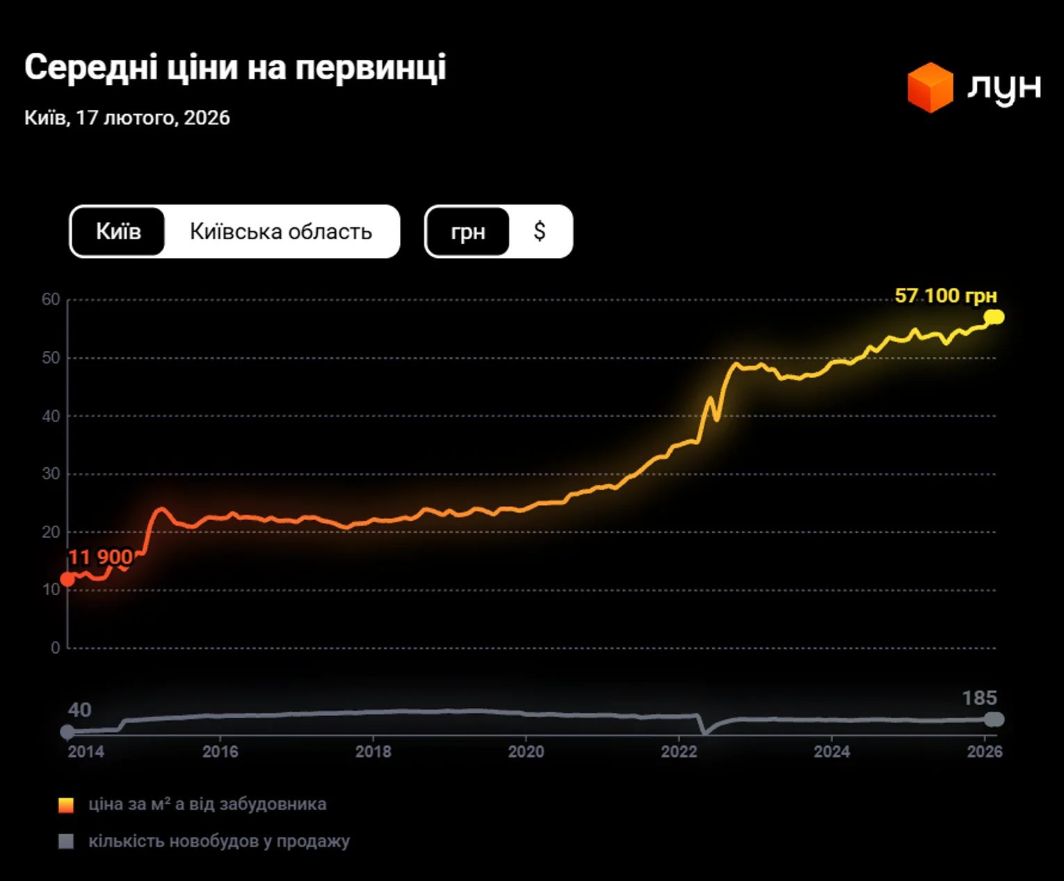 Станом на 17 лютого 2026 року ціни на квартири первинного ринку Києва зросли до приблизно 57 100 грн за 1 кв. м, що вище показників серпня 2025 року